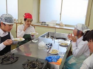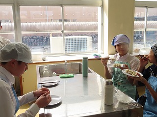 さあ、班ごとでの「いただきます!」の声。食材からみんなで協力をしてできあがった「焼売」と「はりはり漬け」。みんなで頑張ったからこそ、みんなで美味しく楽しく笑顔で食事ができるんだね!2組のみんな楽しそうでした!
