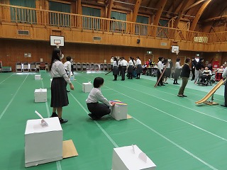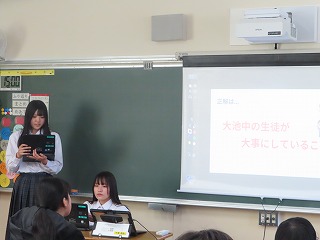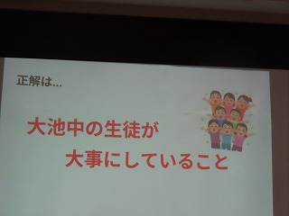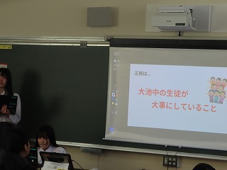 昨年度までは大池中学校の先生たちが小学校に出向き、教室や体育館等で6年生の子どもたちに向けて実施していた説明会を、今年度から、中学校3年生の子どもたちが自分たちで中学校生活における視覚支援資料を作成し、代表の子どもたち自らがガイダンス(紹介)を行うものです。中学生が直接、中学校生活を語ることにより、「あたたかく優しい雰囲気」と「中学校生活をより身近に感じてもらう」ことができるのではないかと思います。