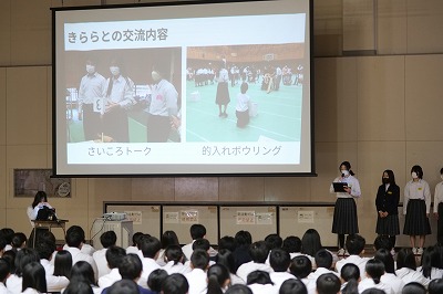 私はきらら学園との交流に行く前は、とても緊張していて不安な気持ちがありました。しかし、実際に話をしたり一緒にゲームをしたりしていく中でお互いに距離を縮めることができました。サイコロトークでは、出た目によって質問に答えました。みんなで盛り上がり、楽しくゲームをすることができたと思います。的入れボーリングでは、車いすに座ったままでも投げやすいよう工夫されていて、みんなで一生懸命取り組んでいました。
