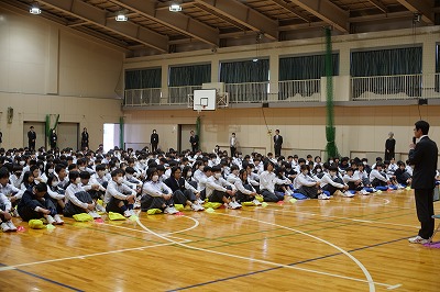 本日3月25日(水)1年間最後の授業。全校集会として2年生、1年生全員が体育館に集まり、生徒会本部役員が主体となった『三重県立特別支援学校 北勢きらら学園』との年間を通した交流会の還流報告会を実施しました。生活会活動の子どもたちが主体となる大切な取り組みの1つである「北勢きらら学園との交流会」。