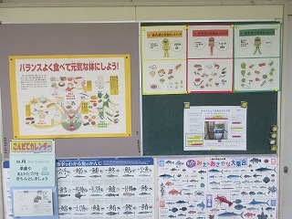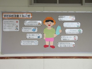 保健室前の掲示板には、「まだまだ注意!熱中症」「バランスよく食べて元気な体にしよう」という掲示物が掲示されています。掲示されている内容を意識して、元気に生活してほしいです。