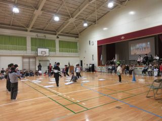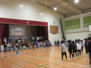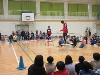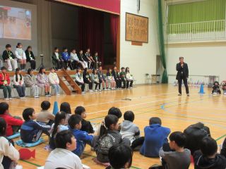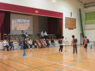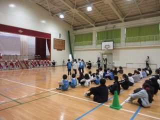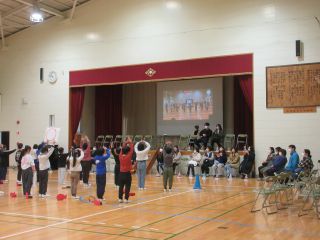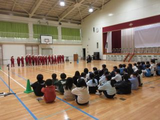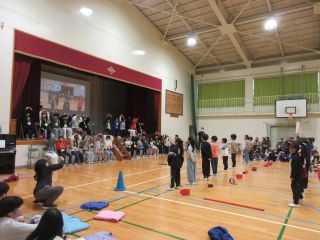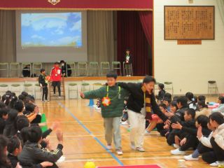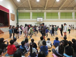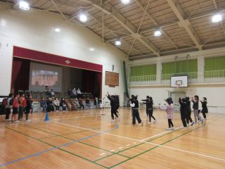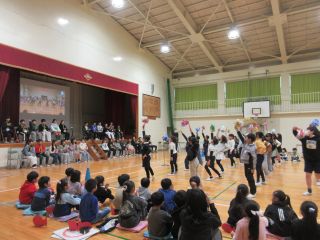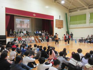 体育館では、6年生を送る会で発表する内容を3年生と一緒に「きしだこども園交流バージョン」にアレンジして、発表を見てもらいました。知っている歌を一緒に歌ってくれている子もいて、うれしく思いました。「ピラミッドじゃんけん」も一緒に楽しむことができました。