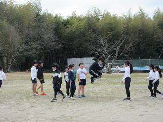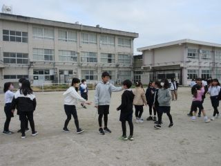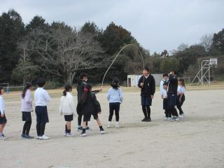 代表委員会主催の「大繩プロジェクト」も今日で最終です。授業が終わると元気いっぱいに運動場に走って出てくる子ども達、縄を回す代表委員のもとへ集まってきていました。「心を一つに、みんなでつながろう」のめあてで、各グループで仲良くなるために、動物の真似をして跳んだり、「かっこよく跳ぼう!」とポーズを決めたりしながら楽しく跳んでいました。最後は、ハイタッチをして解散をしました。