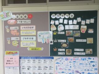 また、給食の掲示では、今月のテーマ「感謝して食べましょう」について掲示されています。小山田小学校は給食の残菜が少なく、そのことは、給食を作ってくださる調理員のみなさんに感謝して食べていることに繋がります。これからも、「ありがとう」の気持ちを込めて、好き嫌いせずに給食を食べてほしいです。