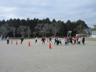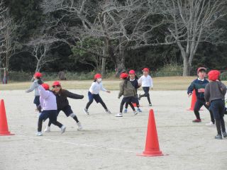 3月になったといえ、今日は少し寒いですが、運動場から元気いっぱいの声が聞こえてきました。1年生が体育科で「ラインおにごっこ」をしていました。初めは先生が鬼になり、ライン上にいる先生にタッチされないようにゴールを目指していました。次は、子ども達がそれぞれのラインに数人立って、そこをすり抜けていきます。鬼にタッチをされないように、時には上手にフェイントをかけて走っていく子ども達、楽しみながら十分な活動量のある学習でした。