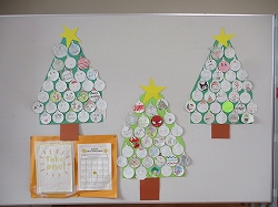 生徒昇降口にあるEnglish Boardがクリスマスバージョンになりました。YEFのブリジット先生が生徒のみなさんから集めた作品をツリーにしてくれました。素敵な絵やメッセージが書かれていますので、ぜひ見てみてください。