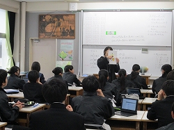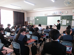 1年生英語では教頭先生との授業です。技術科の先生の自己紹介を聞いて、先生を紹介する文章をつくることが今後のミッションです。ニコニコの教頭先生と生徒のみなさんとのやり取りがよかったです。