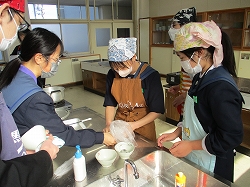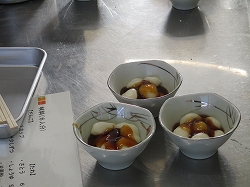 4限目3年生では調理実習がありました。本日短縮日課のためいつもより5分短い調理実習でしたが、班で協力して作業を進めていました。白玉粉に少しずつ水を入れながら、こねていきます。それと同時にたれづくりをし、調理室にはしょうゆのよい匂いが漂っていました。時間内にみたらし団子ができ、満足げな3年生でした。