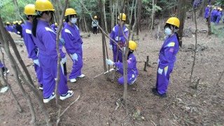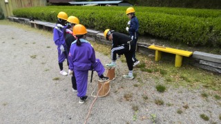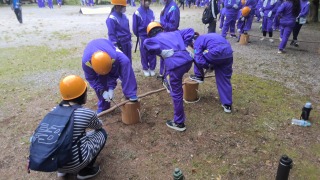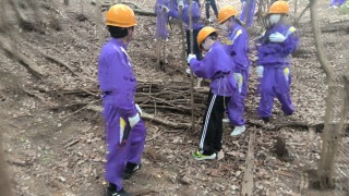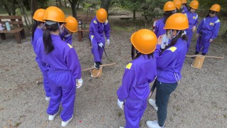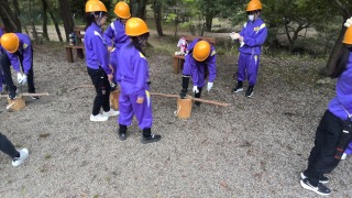 里山保全活動の最中です。少年自然の家の周りにある里山の中から、伐採した木材をさらに細かく切り分けます。これらの木材は乾燥させた後、明日の野外炊事のような場面で燃料として利用されます。