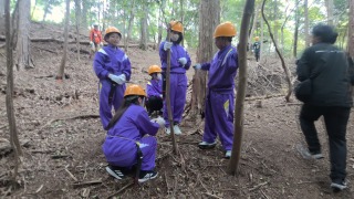 1日目の昼間の活動を終えました。里山保全活動の時間が予定よりも長くなったので、記念写真の時間はカットになりましたが、一人前の木こりになって、大人びた笑顔満開!?