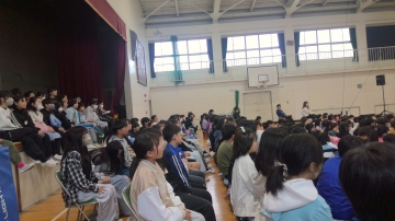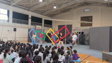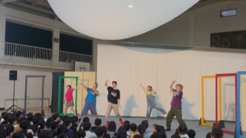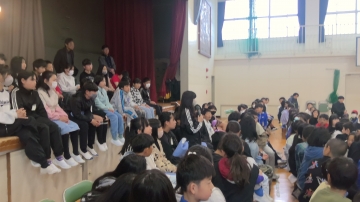1年生と6年生が体育をしていました。玉入れをしたり、蛇じゃんけんをしたりしてからだをほぐしていました。