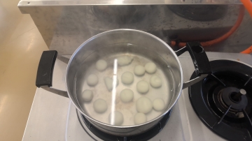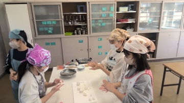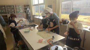 5年生が家庭室で白玉団子をコネコネしていました。「お楽しみ調理」のようです。