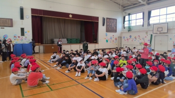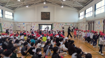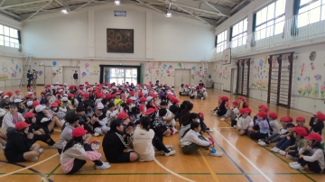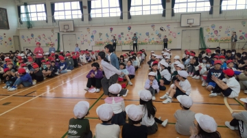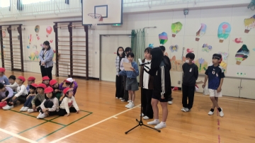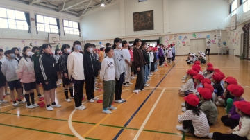 1年生と6年生が体育をしていました。玉入れをしたり、蛇じゃんけんをしたりしてからだをほぐしていました。