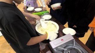 日本の伝統的な日常食であるご飯とみそ汁を調理することで、お米をどぐ、吸水させてら炊く、だしを取る、包丁を使うなど、調理の仕方を知り、簡単な技術をみにつけていきます。
