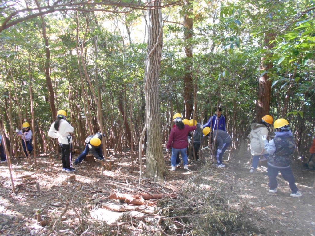 朝ごはんを食べた後、里山保全活動を行いました。のこぎりを持って山に入り、ヒサカキの木を切り倒し、大門池広場に持っていき、小さく切って薪にしました。