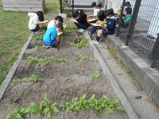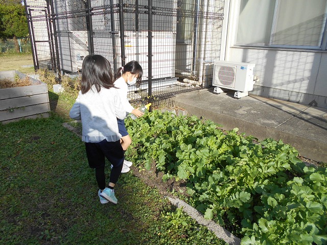 2年生が植えた大根が育ってきました。みんながとても大事に育てたおかげで、ずいぶん成長しました。子どもたちにとっては、とてもいい学習ですね。これからも、子どもたちの努力が報われることがたくさんあってほしいです。