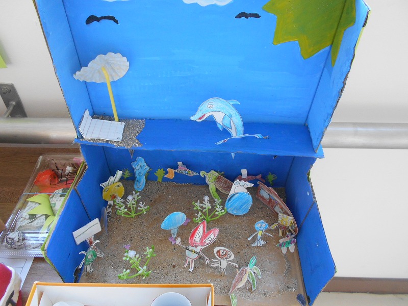 学校では、9月9日(金)まで、夏休み作品展を行っており、教室前の廊下や、家庭室で展示をしています。