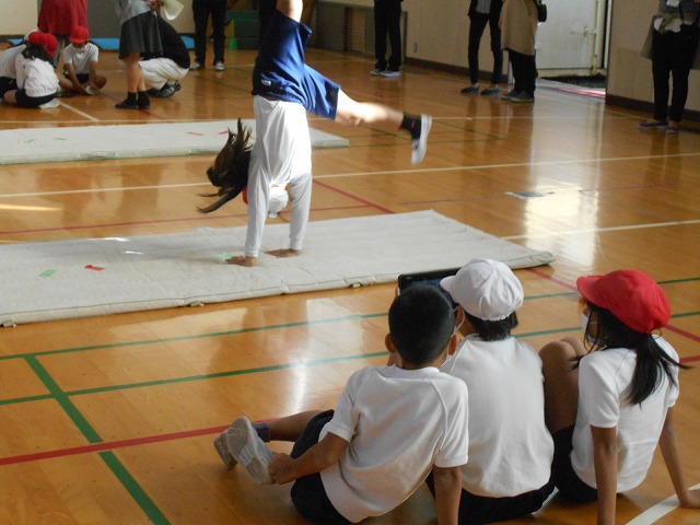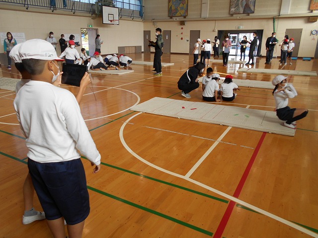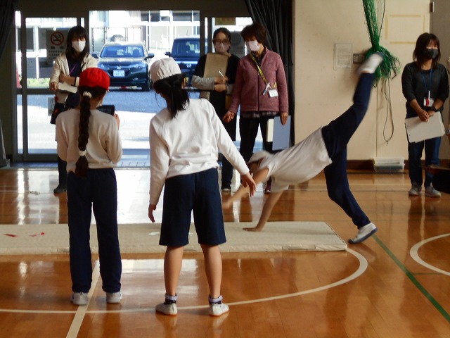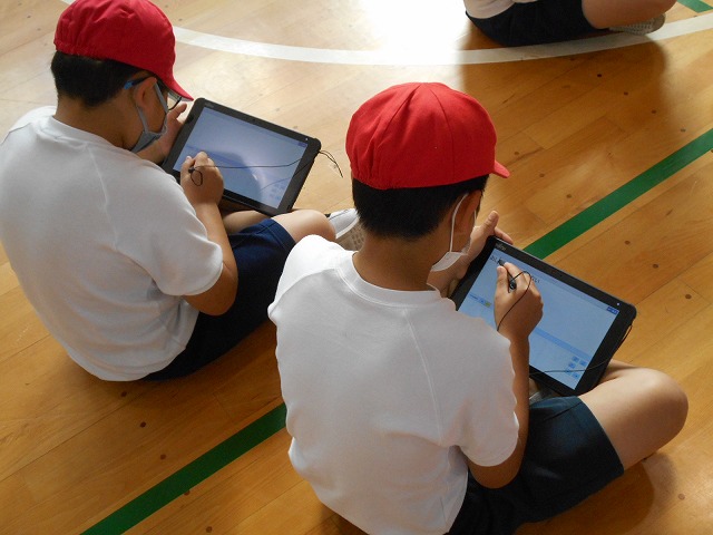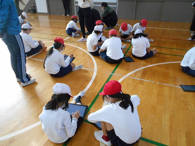 今日は、4年生がマット運動をしていました。苦手な子どもも多い運動ですが、本校の子どもたちは、タブレットを活用して自分の動きを振り返りながら、とてもがんばって取り組んでいました。