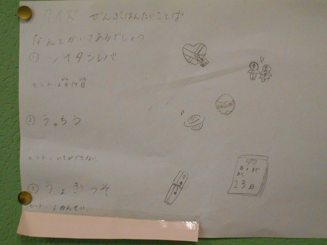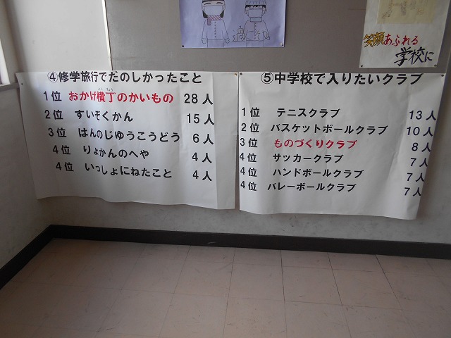 校内を歩くと、子どもたちの、創意工夫あふれるすばらしい作品が目に飛び込んできます。こうした作品を見るのがとても楽しみです。また、3月4日(金)の「6年生を送る会」において、1年生が発表したクイズが、さっそく掲示されていました。1年生は、とても上手に発表しており、とても楽しかったです。