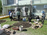 7日(火)から家庭訪問が始まりました。子どもたちが下校した後で、担任以外の職員で花壇の整備をしました。以前は草を捨てる場所として使用していた木の枠の撤去作業をしました。花壇のまわりがとてもすっきりしました。