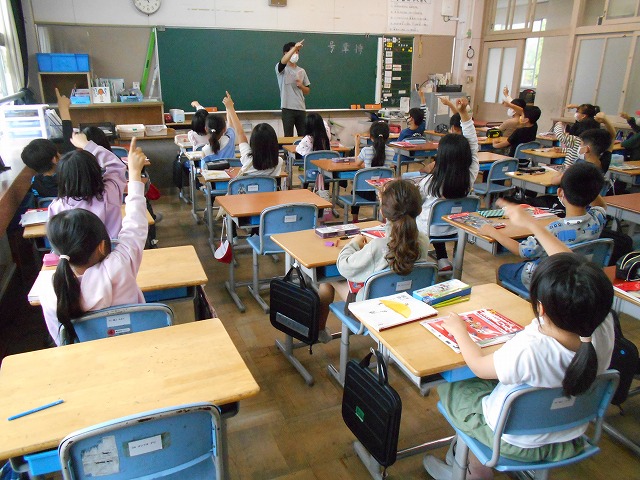 こうした中、今日は、3年生が漢字テストをしていました。先生が出した問題を、空書き(鉛筆を使わずに、空中に指を動かして文字を書く)して、正解した人は立つというテストでした。