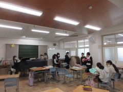 5年生の音楽では、キリマンジャロの曲の合奏に取り組んでいます。ピアニカ、リコーダー、大太鼓、小太鼓、タンバリンなどの楽器を使って演奏します。何度もグループで練習を繰り返し、お互いの音を聞きながらリズムに合わせて演奏できるようになってきました。