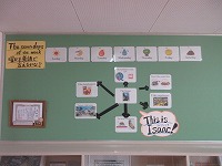 繰り返し練習することは大切です。子どもたちも随分英語で上手に答えられるようになってきました。YEFがホールに自己紹介と曜日の言い方の掲示物を作ってくれました。