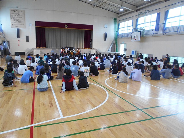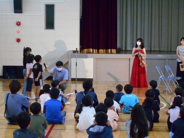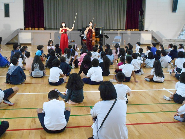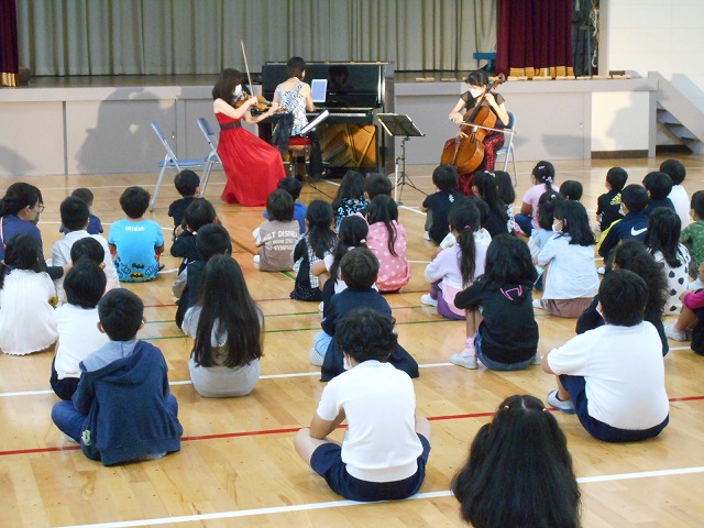 今日は、「フルゴールトリオ」のみなさんに来校していただき、低学年、中学年、高学年の3グループに分かれて、バイオリン、チェロ、ピアノによる演奏を聴いたり、楽器に関するクイズ、演奏体験を行ったりしました。