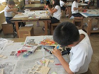 渡り廊下を歩いていると、図工室から「トントントントン」とかなづちの音が聞こえてきました。図工室をのぞくと3年生の子どもたちが、くぎをうって作品づくりをしていました。何本も釘をきれいに並べて打ったり、木が動くようにしたり、釘に輪ゴムをかけたりするなど、どの子も自分の作りたい作品をイメージしながら楽しく取り組んでいました。