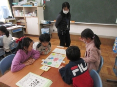 栄養教諭が1年生へ食育の授業をしました。はじめにグループでやさいすごろくをしました。野菜を食べないとどうなるのかについて、すごろくをしながら学びました。野菜を食べないと疲れやすくなったり、風邪をひきやすくなったり、肌がカサカサになったりすることがわかりました。今日の給食は、いつもより野菜を残さず食べることができたようです。