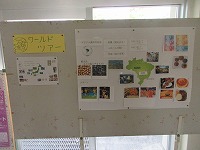 昇降口の掲示板、ワールドツアー第2弾。ブラジルの国の食べ物、スポーツ、文化に関する紹介です。