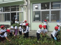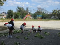 学年の畑で育てていたさつまいもを1年生みんなで掘りました。始めに長く伸びたさつまいものつるを抜きました。どのつるが一番長いかなといいながら地面に並べていきました。