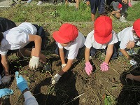 つるを抜いてあとは、いよいよさつまいも堀りです。さつまいもの頭が少しみえているところを掘り進めると、土の中から大きなさつまいもが出てきました。土を掘りながら、「さつまいが出てきた!!」「なかなかでてこないよ」と言いながら、子どもたちはさつまいも堀りを楽しんでいました。堀ったさつまいもは、地域の方にお世話になってやきいもをして食べる予定です。
