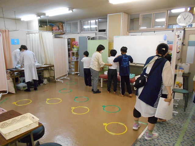 日本の学校では、学校保健安全法に基づき、子どもたちの様々な健康診断を行っています。今日は、1年生と4年生のみが心電図検査を行い、心臓の疾病及び異常の有無を検査しました。1年生は、初めて心電図検査を受ける子どもも多かったためか、検査前は「痛くないかなぁ」と心配している様子も見られましたが、検査後は、「痛くなかったよ」と言いながら、笑顔で教室へ帰っていきました。