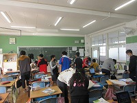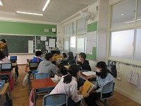前回の続きを中学校の英語の先生に授業をしていただきました。今日は行きたい国を尋ねることができること、なぜその国に行きたいのか理由を伝えらえることが目標でした。中学校の先生からは、「伝えること」とは、相手にわかるように話すことで、わからないときは「One more please.」と尋ねることなど、コミュニケーションをする上で大切なことを教えてもらいました。行きたい国やその理由を考えた後、友達に尋ねたり、答えたりする練習をしました。