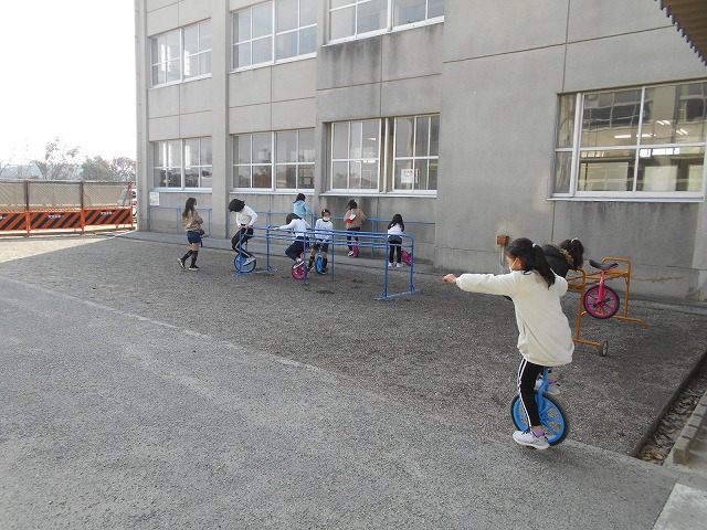 このような子どもたちのがんばりを応援するため、PTA予算から、一輪車練習用スタンドを設置していただきました。ありがとうございました。