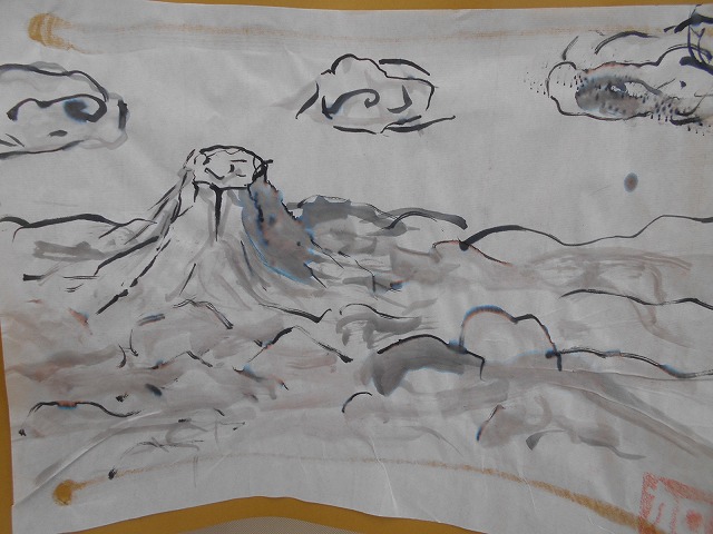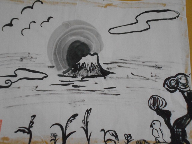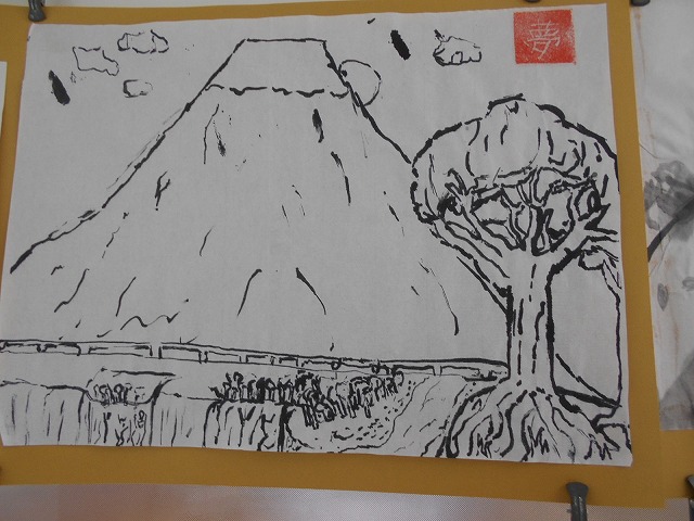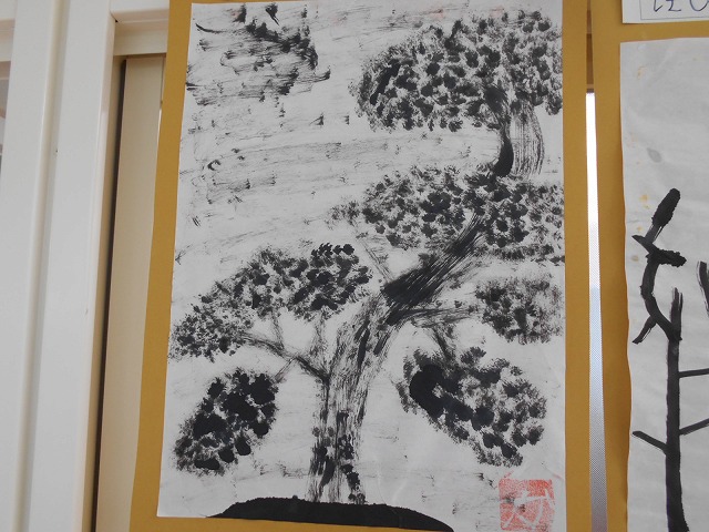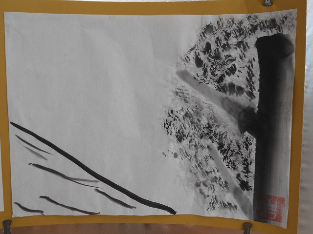 廊下を歩いていると、子どもたちがつくったすばらしい作品が目に飛び込んできます。6年生の教室の前には、水墨画が掲示してありましたので、しばらくの間、その独特の雰囲気を味わい、楽しみました。