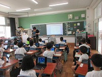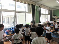 1年生の教室では、タブレットの使い方を学習していました。電源を入れて、パスワードを入れてログインします。次に学年・組を選ぶと、自分の名前が表示されます。1年生の子どもたちは、大丈夫かなと思いながらもワクワクしながら操作していました。今日は、タブレットのカメラ機能を使って、友達の写真を撮る練習です。とてもうれしそうにお互いの写真を撮っていました。夏休みの宿題は、あさがおの成長の様子をタブレットで撮影します。きれいな花の写真が撮れるといいですね。