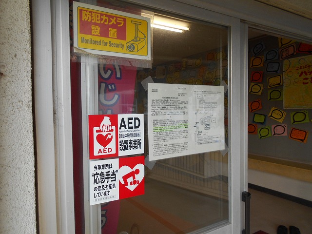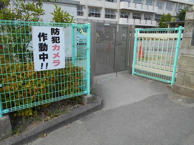 学校では、子どもたちの安全確保のため、必ず門を閉めており、防犯カメラ、さすまた、AED等を準備しています。