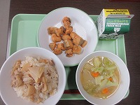 今日の給食は、「たけのこごはん、さわらの香味あげ、春野菜のみそ汁」でした。春に旬の野菜や魚などをつかった栄養たっぷりのメニューでした。たけのこごはんの筍は、三重県産の生のたけのこを使っています。