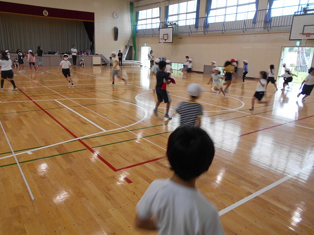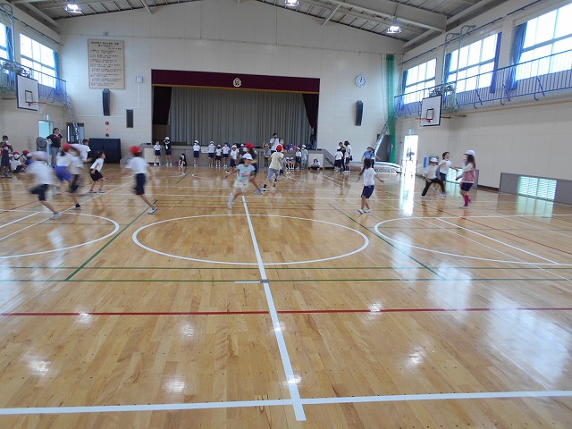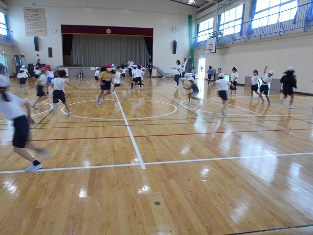 この時間は、4年生と2年生のクラスが合同で体育をしていましたが、普段は一緒に体育をすることがないクラスの組み合わせでしたので、いつもとは違う面白さがあったと思います。子どもたちは、大喜びで鬼遊び(ゲーム)をしていました。4年生の子どもたちが、良いお兄さんとお姉さんになってくれており、とても嬉しくなりました。