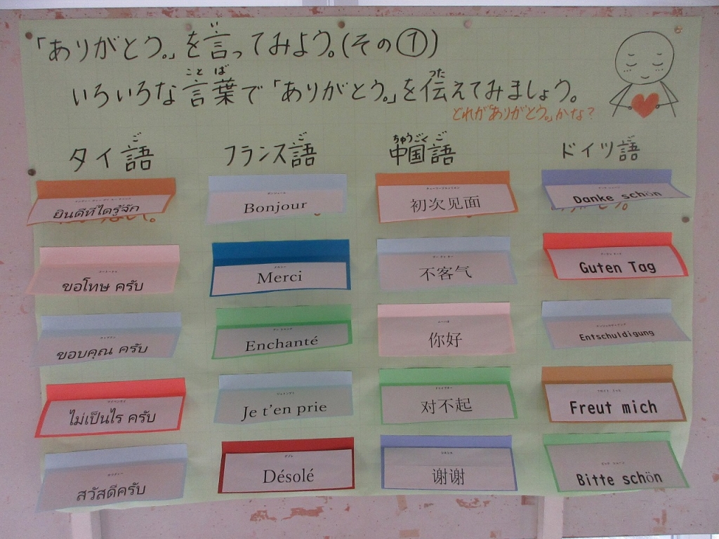 中央昇降口:いろいろな言葉で「ありがとう」を伝えよう。