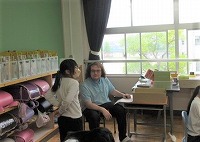 4年生の英語の授業では、YEF(ネイティブスピーカー)に自分の好きなことや嫌いなことを英語で伝える活動をしていました。今回は、1対1で話をすることに挑戦しました。ネイティブスピーカーを前に英語で自分の思いを伝えることは勇気のいることです。でも、うまく伝えることができれば、自信にもつながります。本校は、外国籍の児童が多いので、比較的、外国の方とのコミュニケーションは抵抗が少ない子が多いと思います。しかし、日本語ではない英語で会話をすることは、経験が必要です。