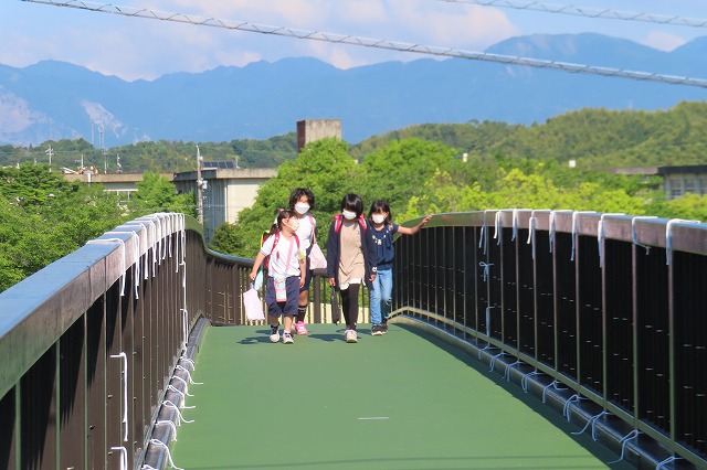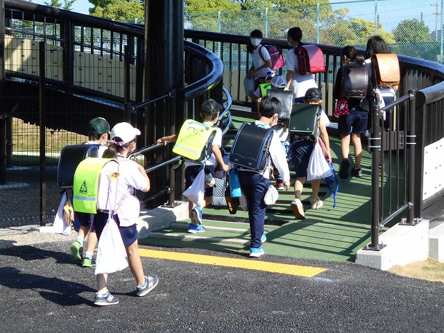 本日から、通学路として歩道橋を通れるようになり、令和4年度は、完成した記念すべき年になりました。20年後、子どもたちが成長し、「〇年生の時に歩道橋が完成し、みんなが通り始めたんさな。」なんて思い出している様子を想像すると、感慨深いものがあります。