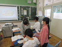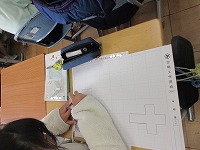 4年生の算数では、方眼画用紙を使って、立方体を作る活動をしていました。実際に箱を切り開いて展開図を考えたり、試しに描いた展開図を組み立ててうまくいかなかった理由を考えたりしました。どうするとうまく作れるのか友達も相談しながら作業を進めていました。