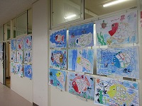 2年生は、絵具とクレパスを使って魚の絵をかきました。きれいな魚が楽しそうに海の中を泳いでいます。