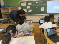 5年生の算数では、様々な図形の面積の求め方を学習しています。今日は、台形の面積の求め方をタブレットを使って考えました。タブレットの画面上で、台形を切ったり、動かしたりしながら、今まで学習した図形(長方形・平行四辺形・三角形など)に形を変えて考えました。プリントを使わずに、タブレットの画面上で考えることができるので、子どもたちにも考えやすく、いろいろな方法を試すことができました。