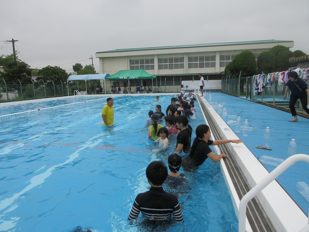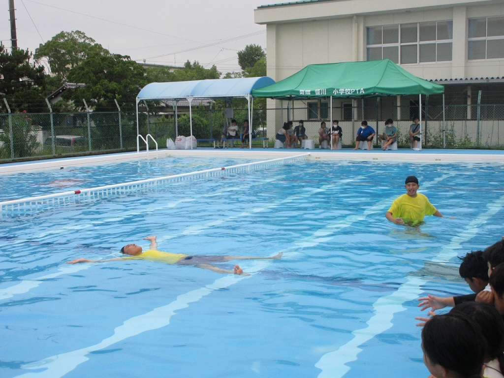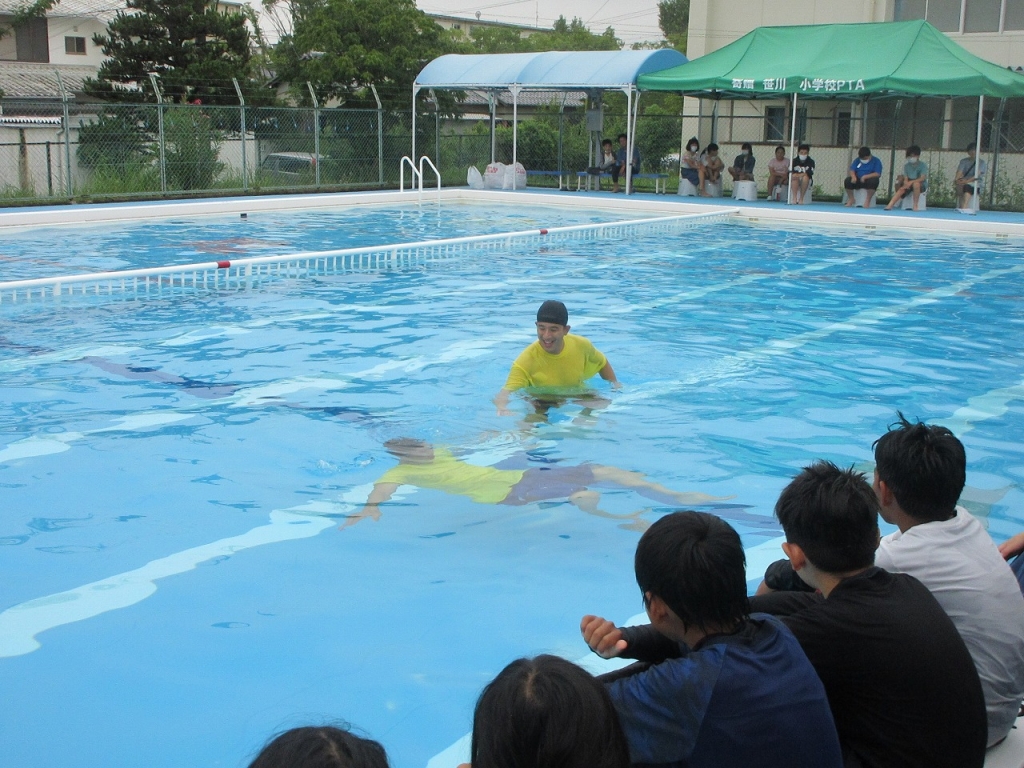 講師の方からは、溺れそうな人を見かけたときは、絶対に自分で助けに行かずに大人を呼ぶこと、ペットボトルなど浮きやすいものがあったら投げ入れることなどを教えてもらいました。最後に、着ていた服を脱いで水着だけでプールに入りました。子どもたちは、軽くなった自分の体に驚くとともに、いかに服を着たまま水の中に入ると重くなるかを実体験として学ぶことができたようでした。