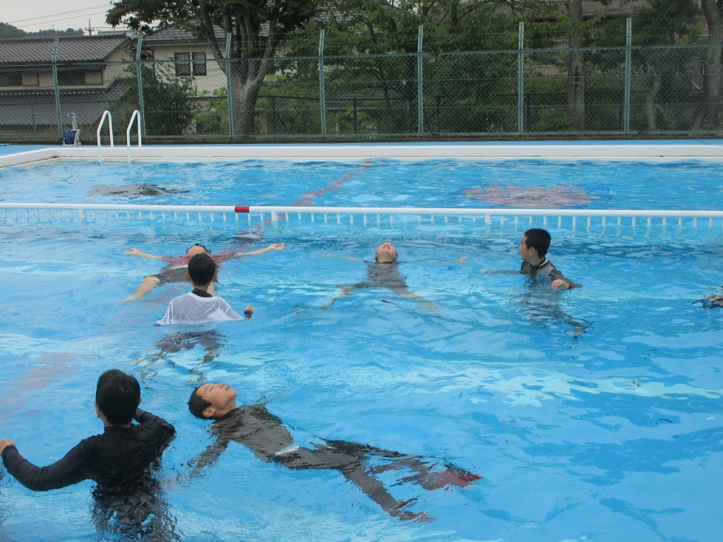 実際に、大の字になって浮く練習をしてみました。お家から持ってきたペットボトルを服の中に入れて抱えると浮きやすくなりました。