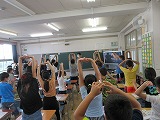 リズムに合わせて体を伸ばしたり(tall)、縮めたり(short,tail)しています。これは、アルファベット(小文字)の大きさを視覚で捉える活動です。